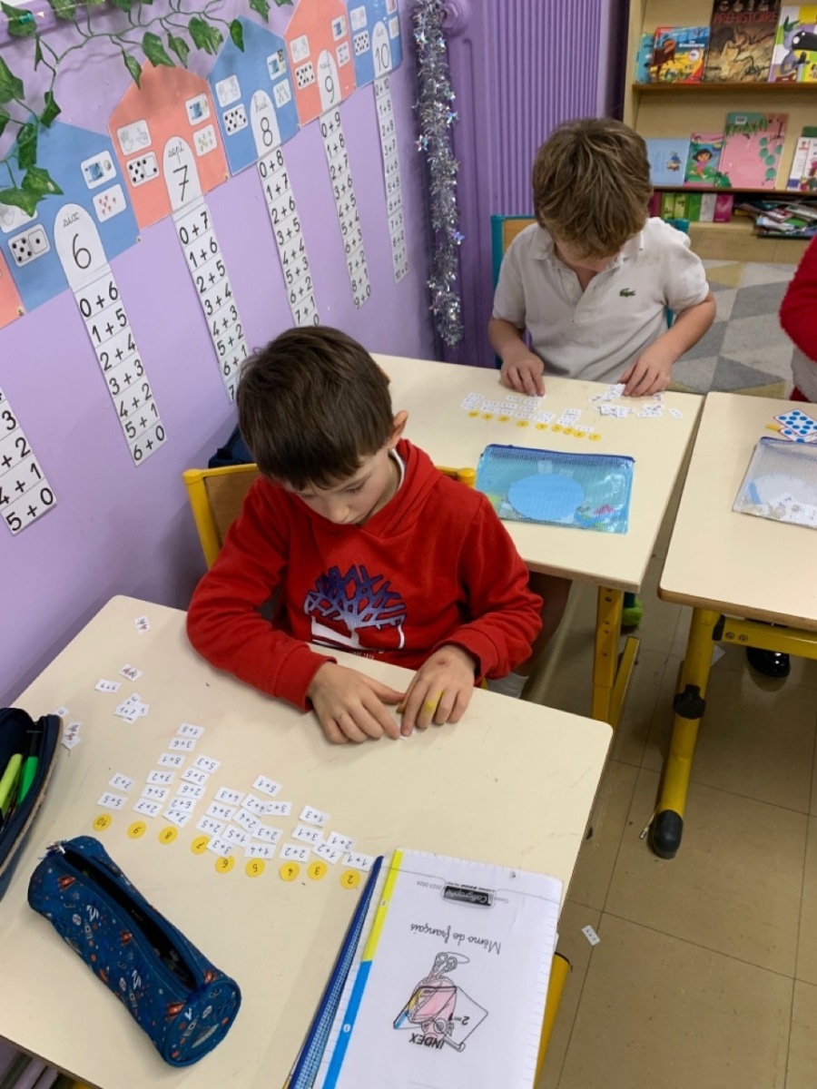 En lecture, les lettres chantent, s’écrivent et se signent avec la méthode Borel Maissony. Quant aux mots outils, chaque enfant a une boîte avec tous les mots étudiés qu’il peut manipuler en classe ou à la maison pour apprendre à les reconnaitre puis les écrire.