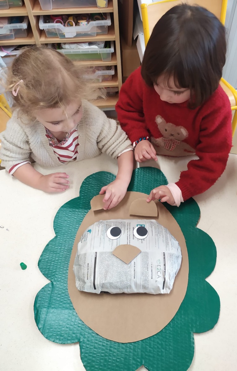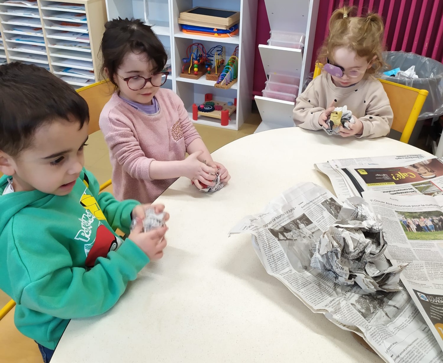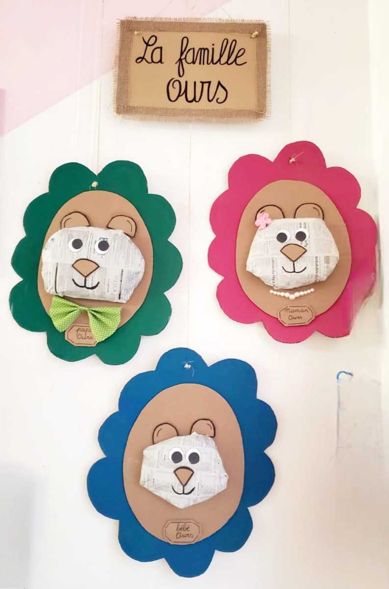 - une oeuvre commune présentant la famille Ours, à base de papier journal et de carton.