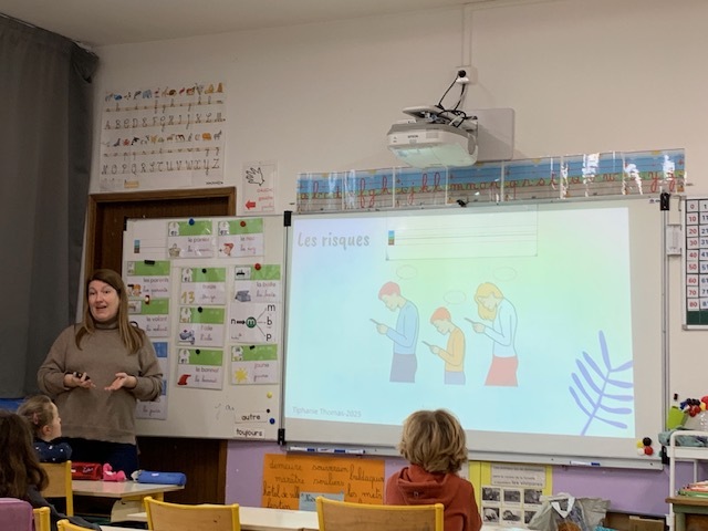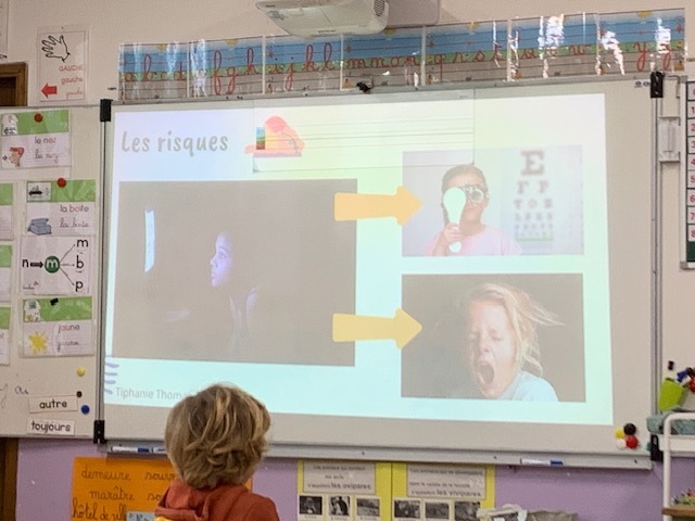 L’intervenante a ensuite expliqué aux élèves les risques d’une utilisation excessive : problèmes de vue, diminution des interactions sociales, troubles du sommeil et risques de cauchemars liés à des contenus inappropriés.