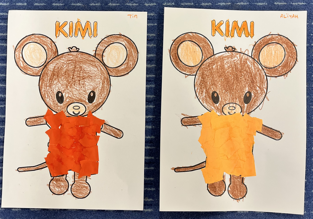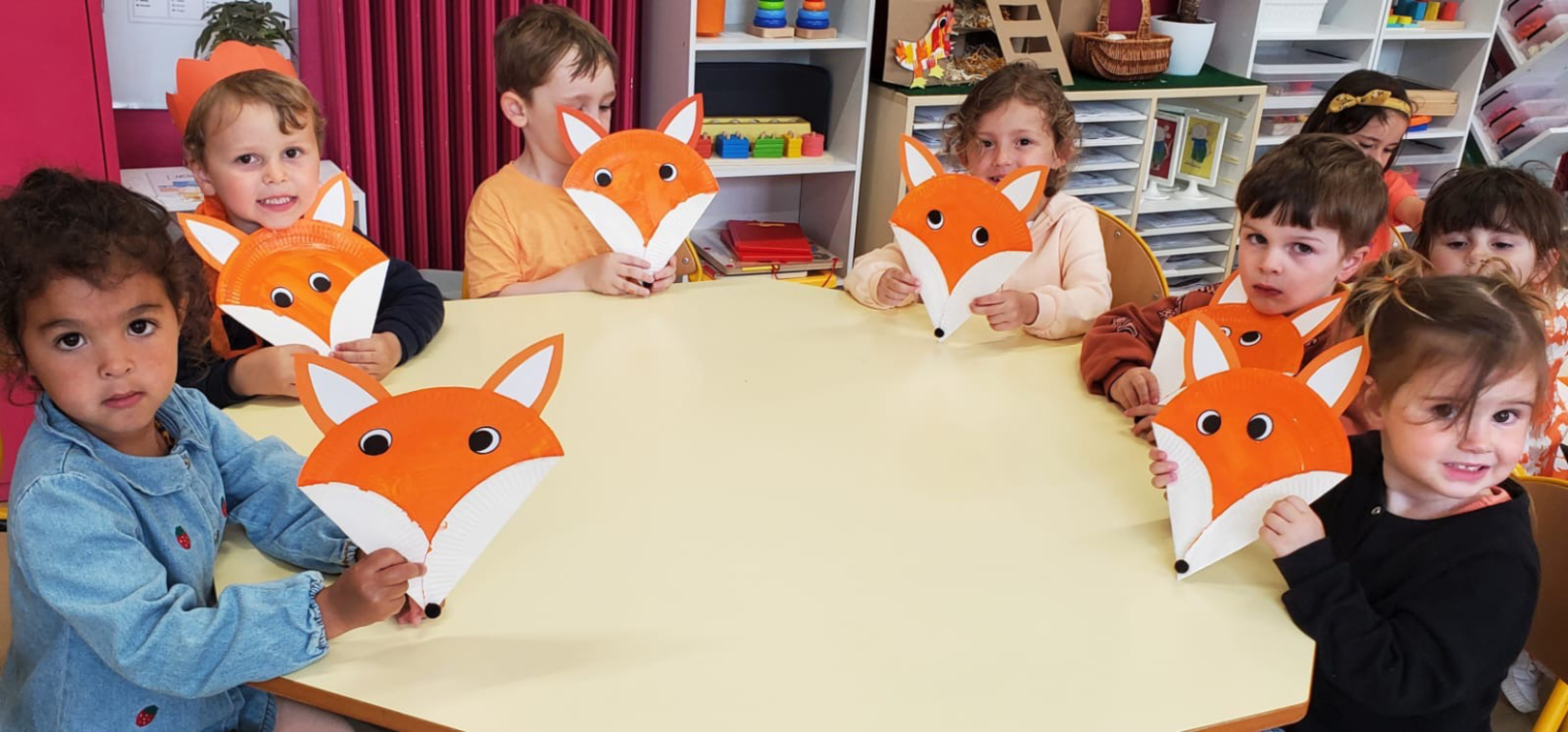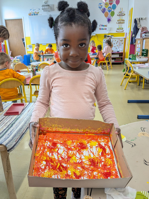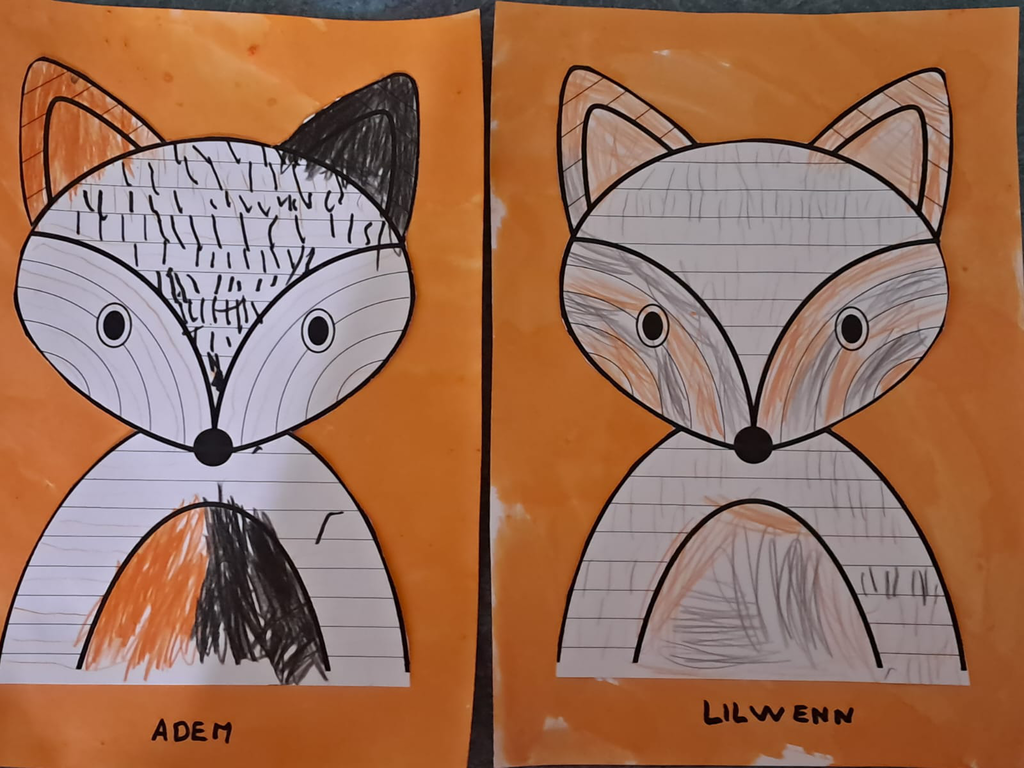 - bricoler, dessiner, peindre, coller: des renards à partir d’assiettes en carton, des renards en graphisme, Des collages sur la mascotte Kimi. Dessiner des bonhommes. Mélanger du rouge et du jaune en faisant rouler des billes dans la peinture et observer le résultat.